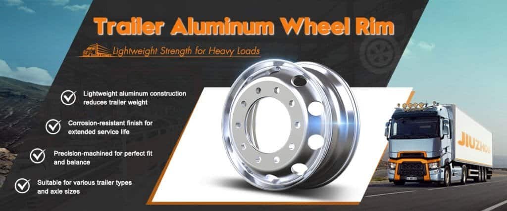 The aluminum wheel rim reduces trailer weight, improves fuel efficiency, and enhances durability, making it ideal for heavy-duty semi-trailers and long-haul transport.