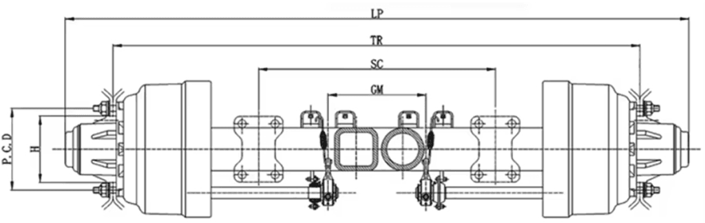 | Model | Max. Capacity (T) | Axle Beam Size | Brake(mm) | Plate spring spacing (mm) | Center distance of chamber(mm) | Track(mm) | Studs(mm) | P.C.D(mm) | oH | Ttal Length(mm) | Recommender Wheel |