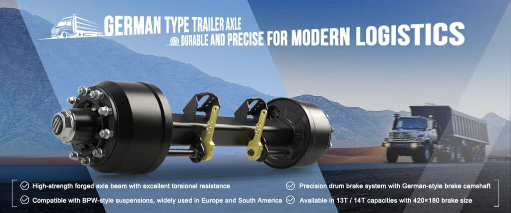 High-performance German type trailer axle with forged beam and drum brake system. Compatible with BPW suspension, ideal for heavy-duty trailers and export use.