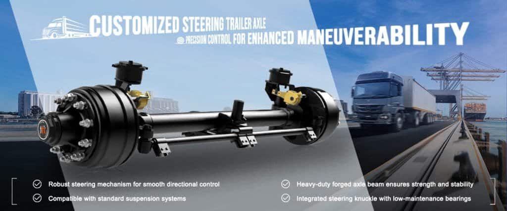 The steering axle helps improve turning radius, reduces lateral tire slip, and enhances stability during cornering, especially for long or heavy trailers.